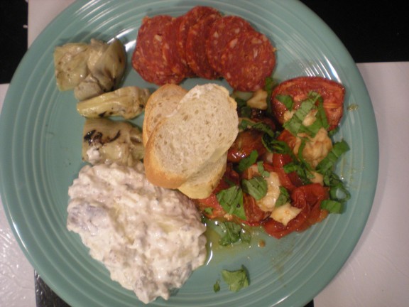 Antipasto literally means “before the meal” in Italian. Starters, hors d’oeurves, appetizers may signify the same thing in other languages but in our case this was the meal. On the eve of Labor Day, hot and humid as usual in Austin, Texas, I decided we should indulge in a few of my favorites things. A little store bought Calabrase salame, delicious fresh mozzerella, and home baked eggplant and tomotoes. We ended up with platter full of color, texture and flavor.